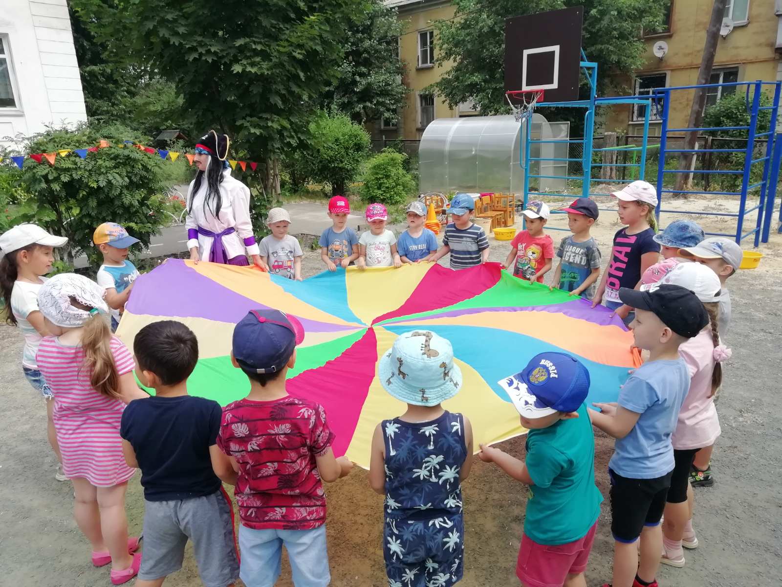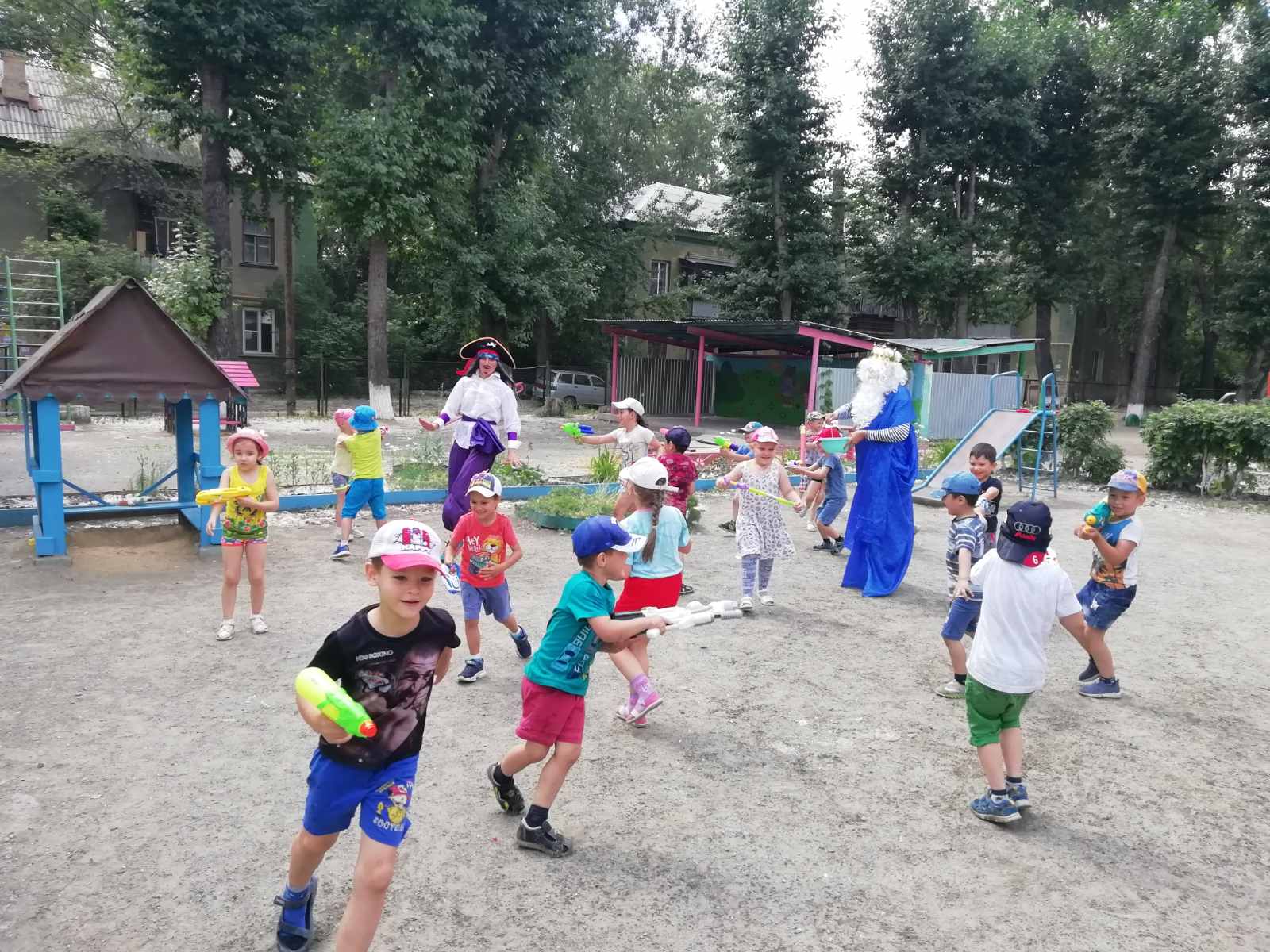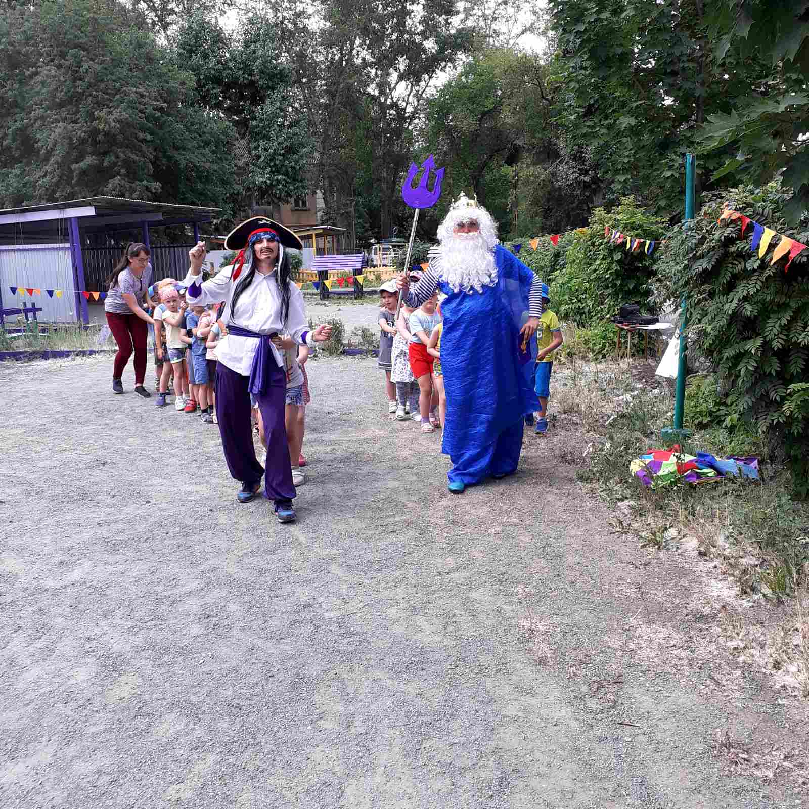 17 июня в нашем ДОУ прошел музыкально-спортивный праздник "День Нептуна!". К ребятам на праздник пришли пираты, Полундра и Джек Воробей. Джек Воробей утащил трезубец Нептуна, который в свою очередь забрал сундук с сокровищами. А какой же пират без сокровищ? И чтоб вернуть этот сундук, нужно было заработать метки добрых дел. Ребята стали отличными помощниками пиратам. После собранных меток, ребята позвали Нептуна, который с удовольствием поиграл с ребятами и вернул сундук пиратам. А в завершении праздника, с удовольствием, все опрыскивались водой.