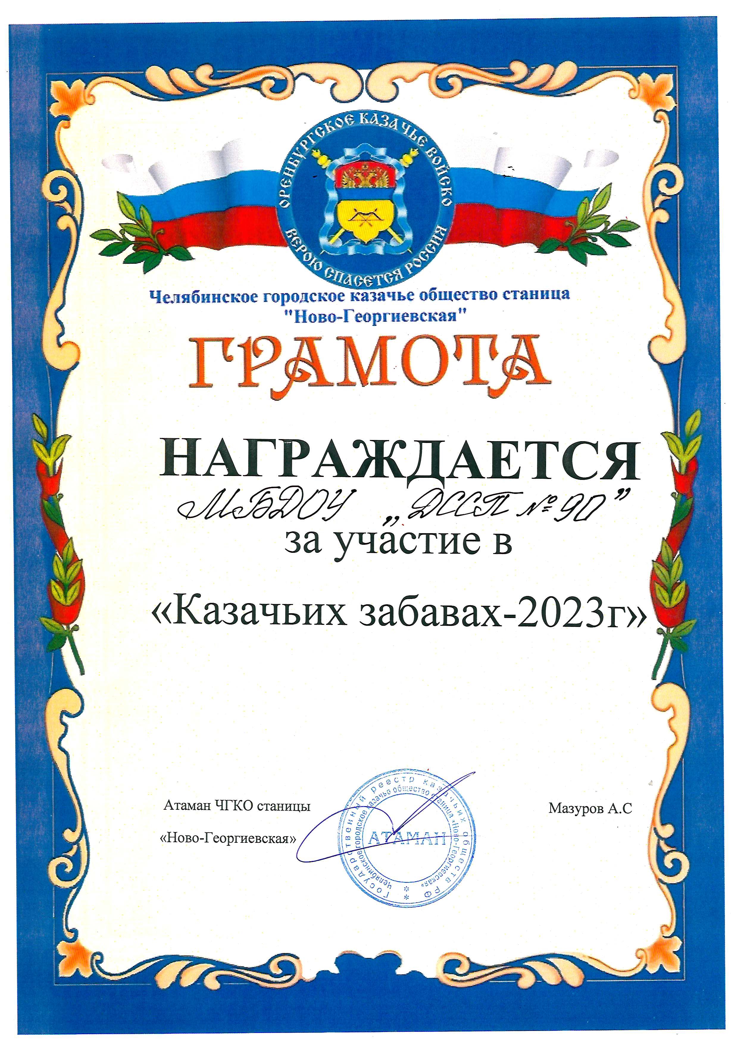 Торжественное спортивное мероприятие провести для ребят пришли казаки Челябинского городского казачьего общества станицы "Ново - Георгиевской" Они рассказали о своей службе, традициях, поздравили с наступающим праздником и провели соревнования.