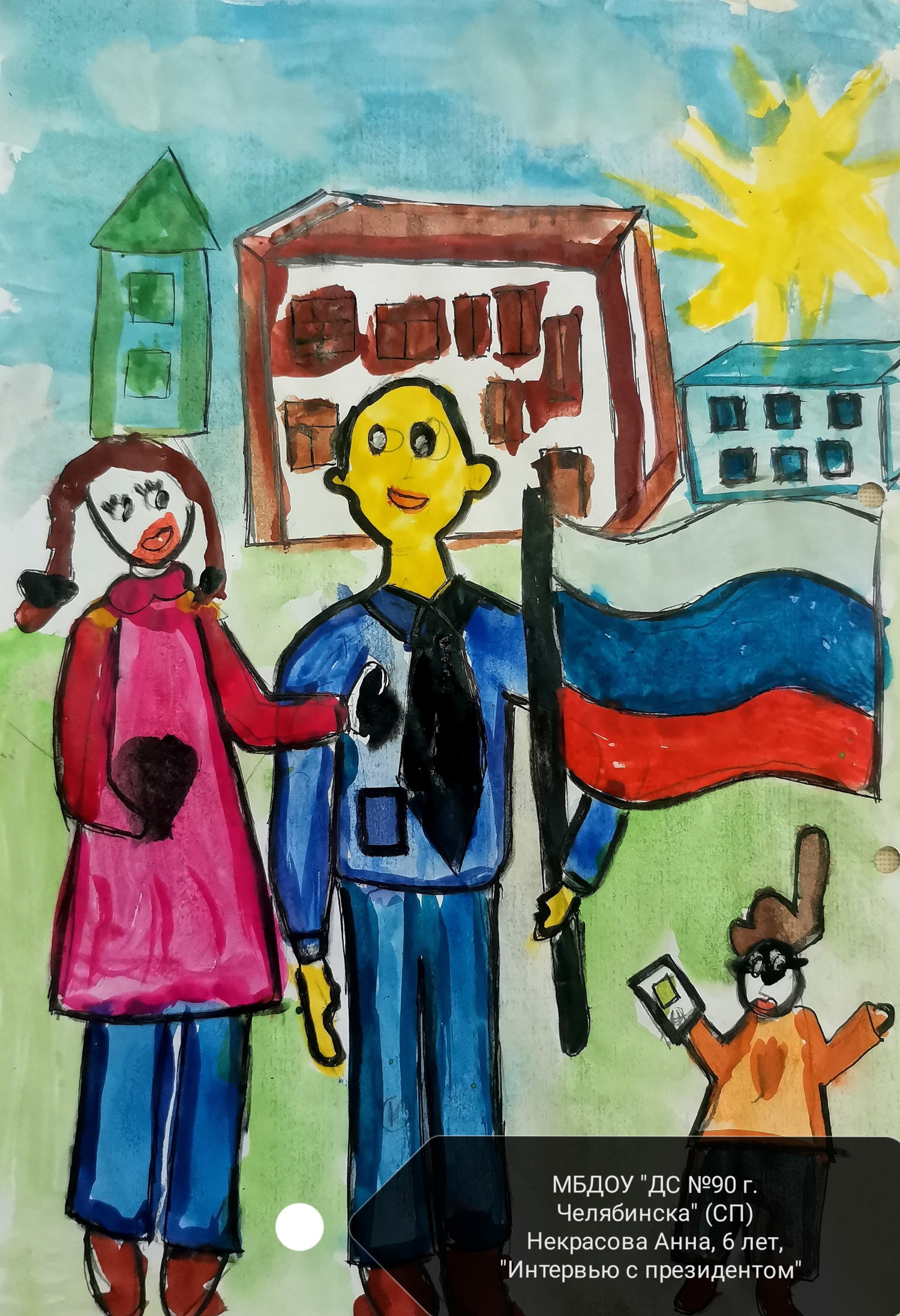 Стартовал городской фестиваль-конкурс детского творчества дошкольных образовательных учреждений "Кем быть?". Воспитатели и дети нашего детского сада приняли активное участие в мероприятии. Подготовили работы во всех трех номинациях: В конкурсе рисунков участвует Анна Н, она нарисовала журналиста который берет интервью у президента.