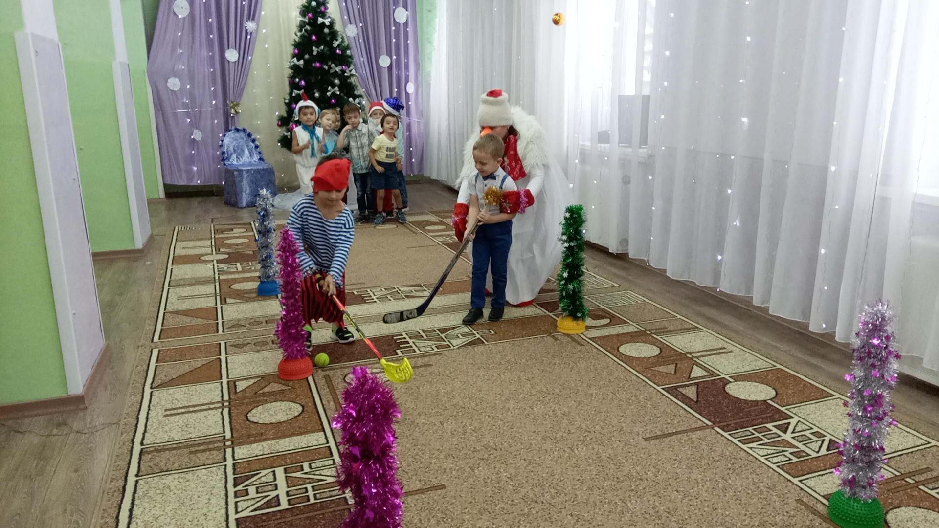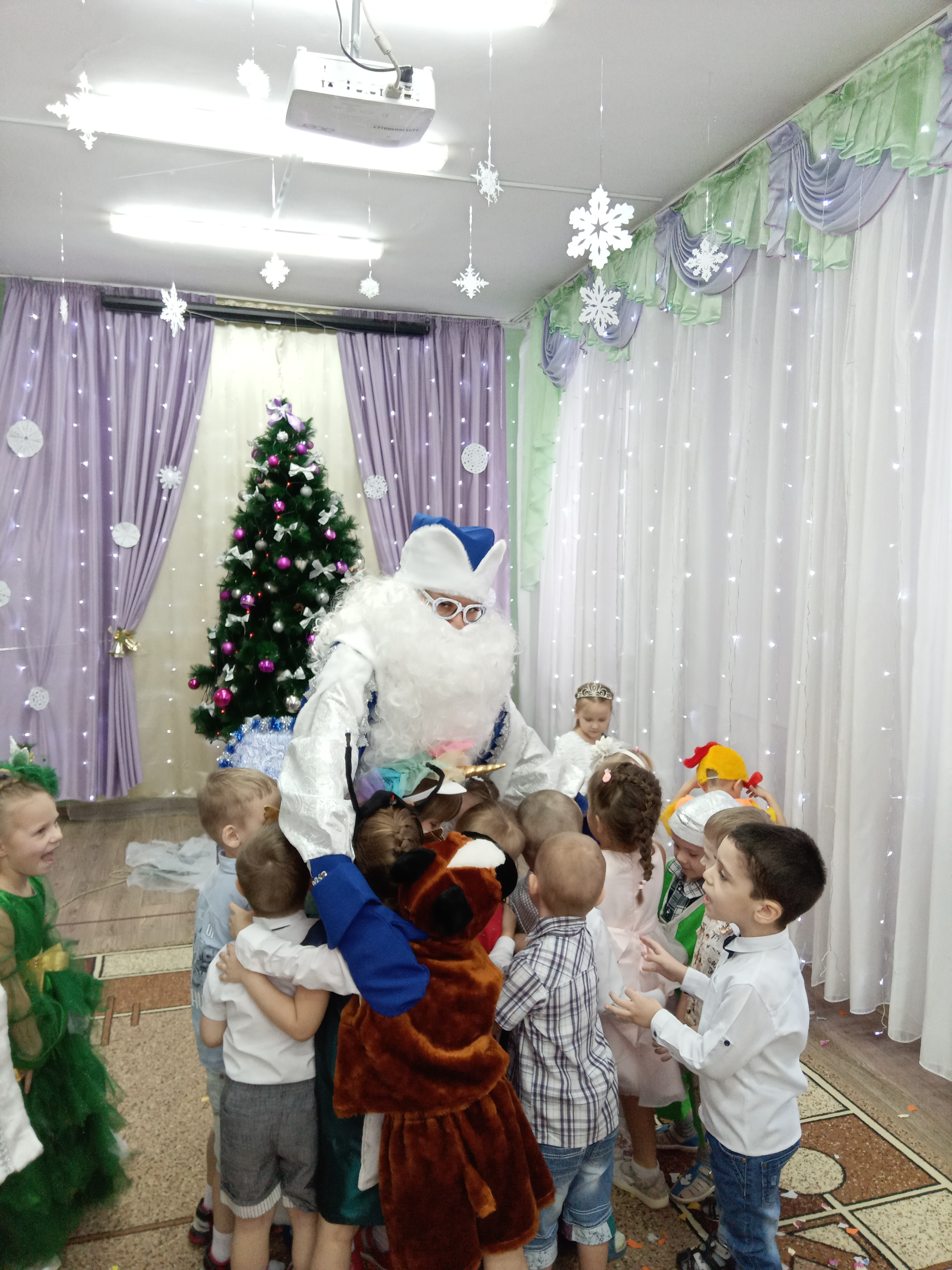 У ребят старшего дошкольного возраста на празднике был символ 2022 года Тигренок, у которого злая цыганка забрала подарок для елочки. И чтоб Тигренок не расстраивался ребята со Снеговиком развлекали его, играя в зимние эстафеты. Пока ребята играли полицейский поймал нарушительницу и вернул подарок Тигренку, а цыганка пообещала больше не красть и быть хорошей и доброй. И конечно же, в гостях у ребят были и Дед Мороз, и Снегурочка. Все вместе дружно играли, танцевали. Дети порадовали Деда Мороза стишками, а Дед Мороз вместе со Снегурочкой наколдовали ребятам подарки.