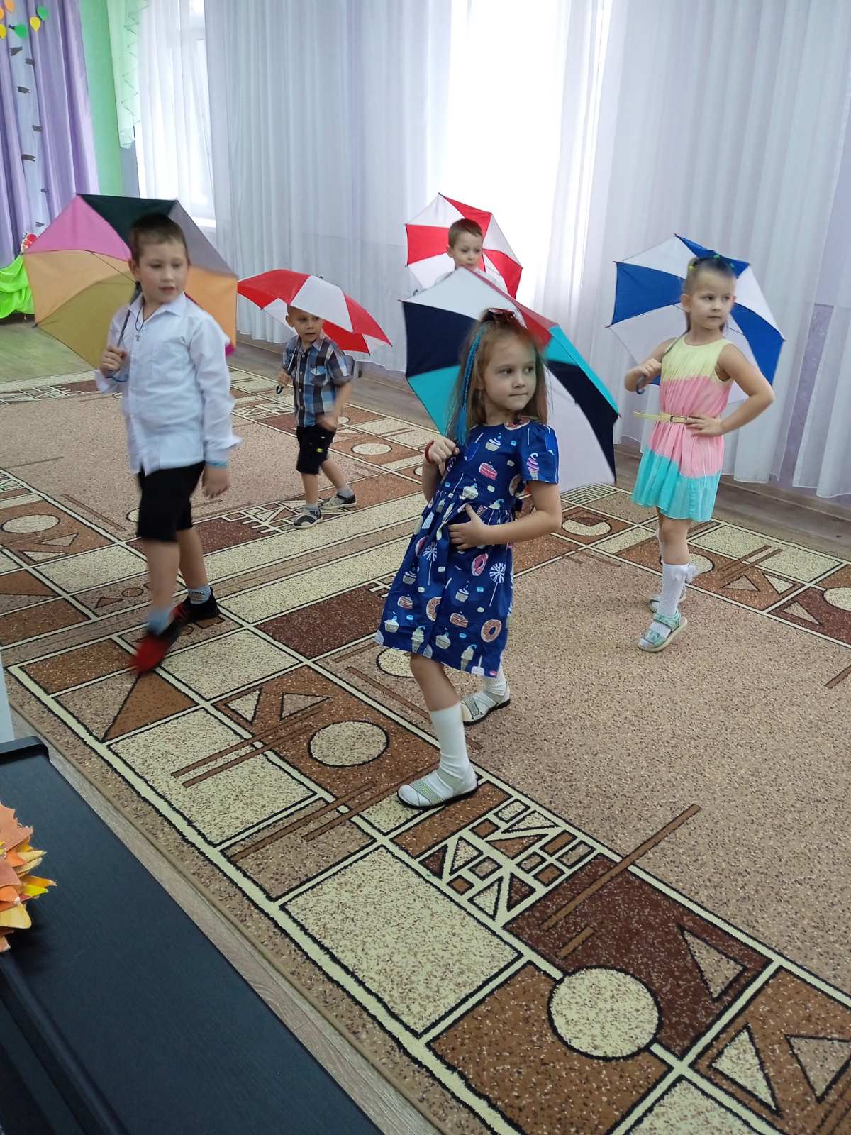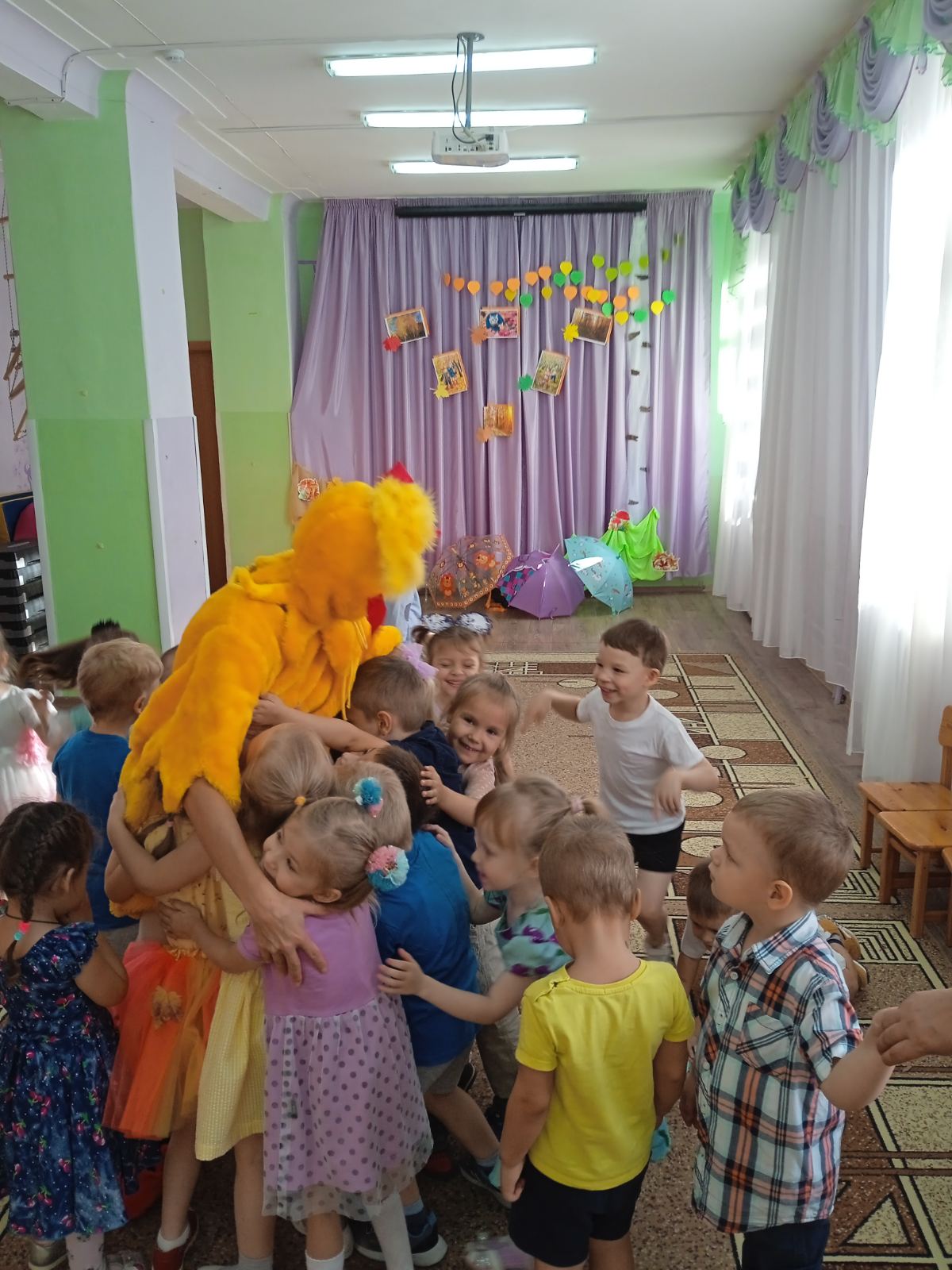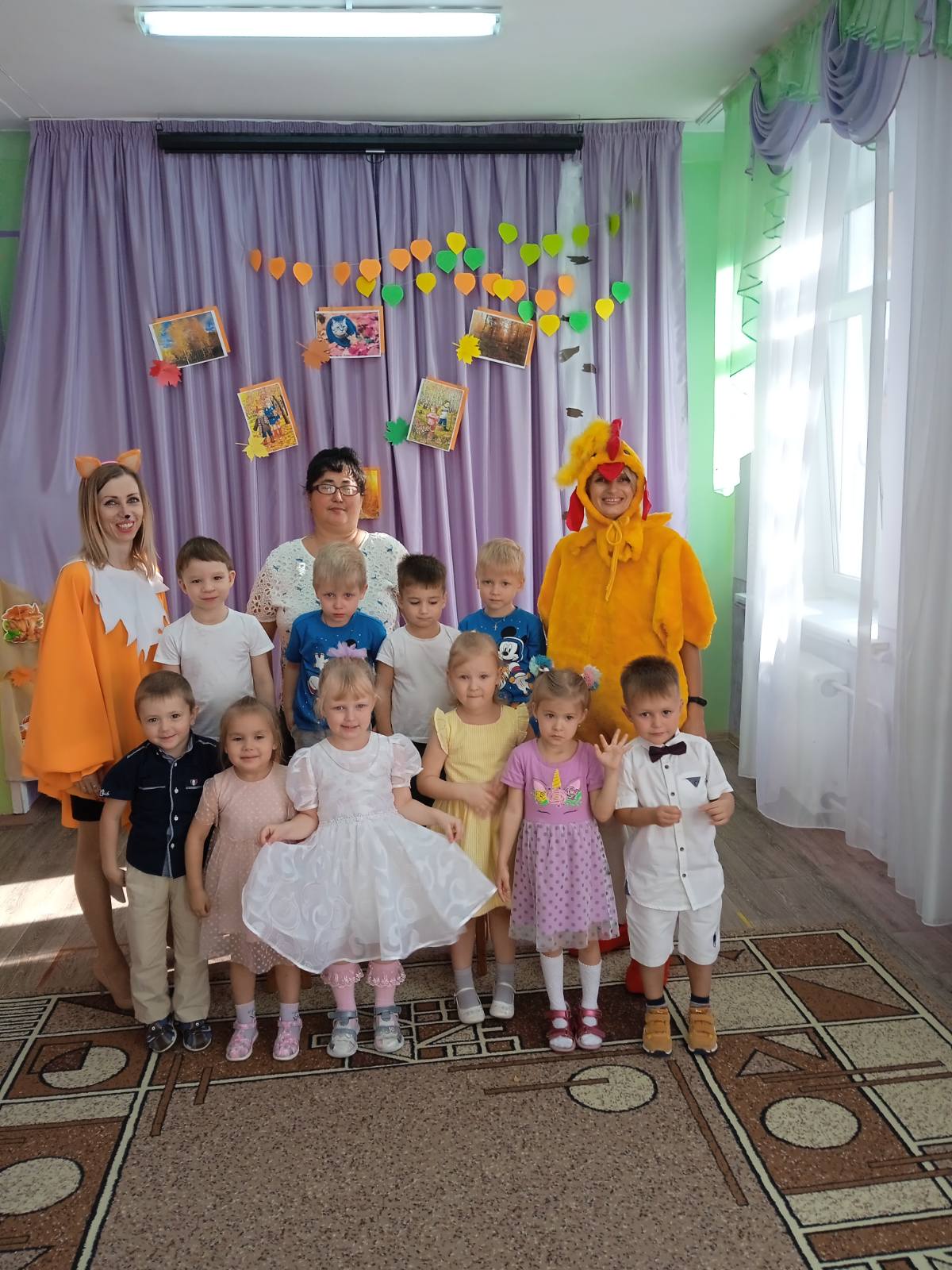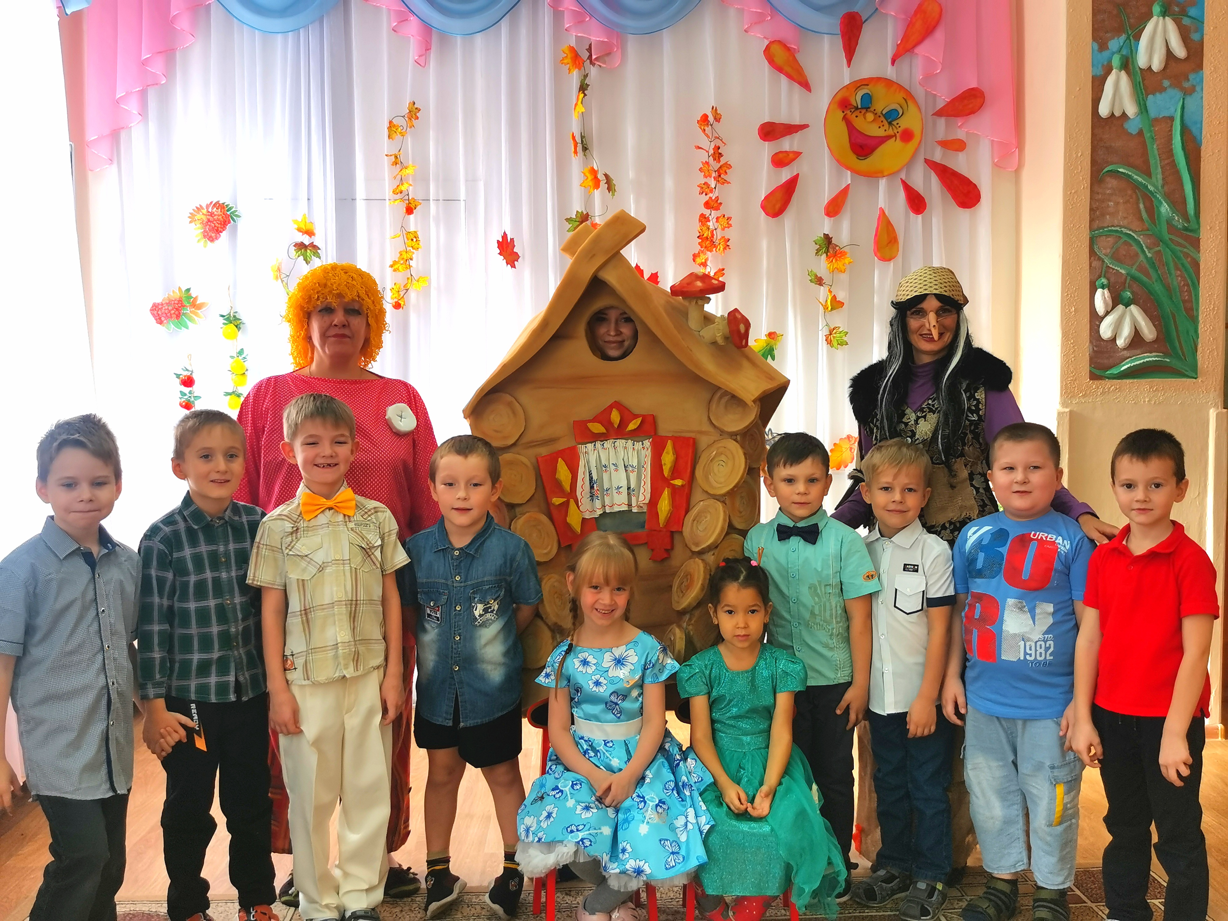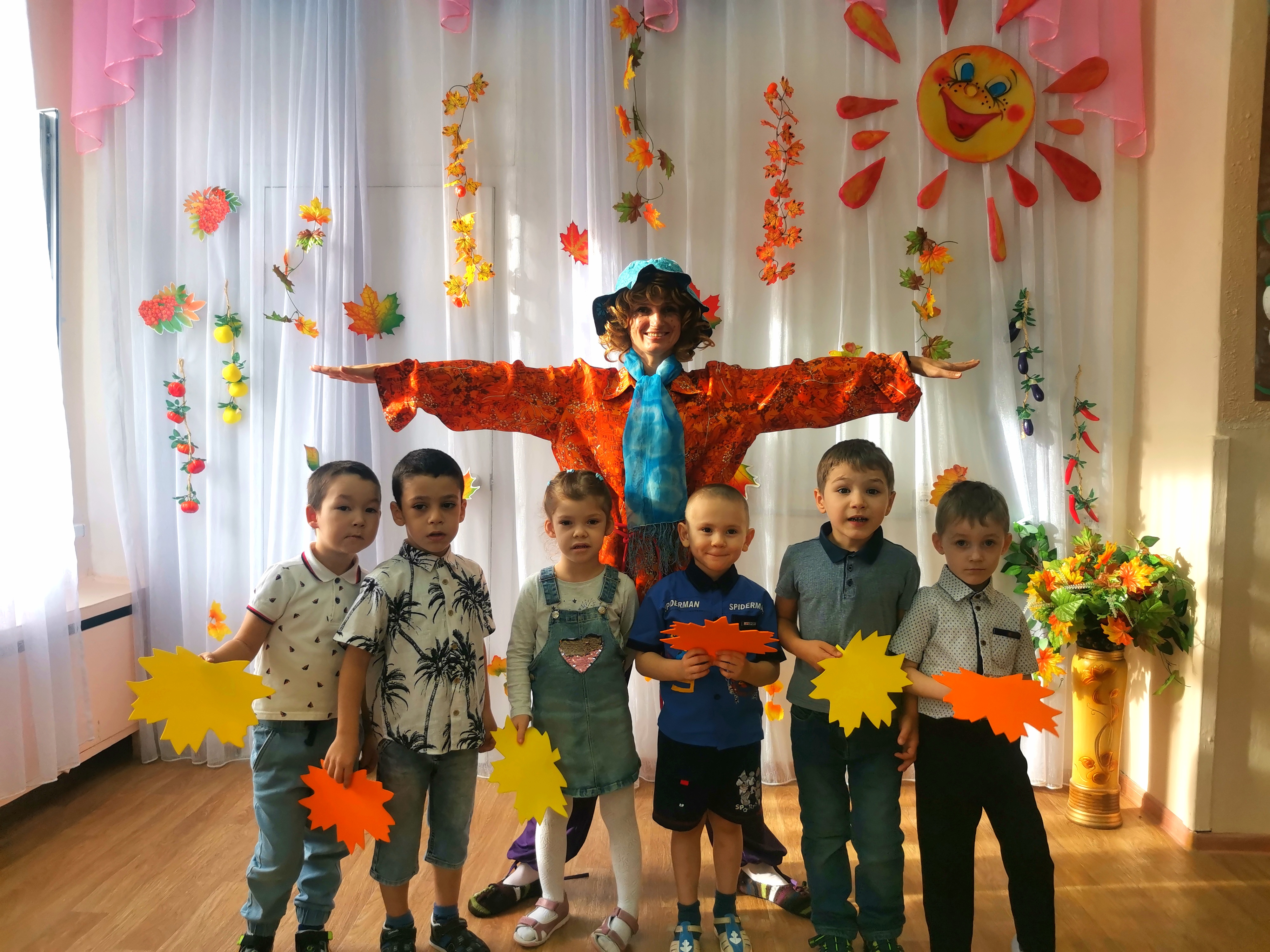Каждый год, в нашем детском саду, проводится праздник осени. Это яркий и красочный праздник, который помогает детям закрепить представления об осени. Красиво украшенный зал создаёт праздничное настроение. Праздники начались с веселой музыки, создавшей праздничное настроение, дети пели, читали стихи, танцевали и играли для гостей пришедших к ним в гости. В гостях на празднике у них побывала Осень и принесла им угощение, Огородное Пугало, домовенок Кузя с бабой Ягой, лисичка и Петя петушок. Все дети получили положительные эмоции и остались довольны праздником.