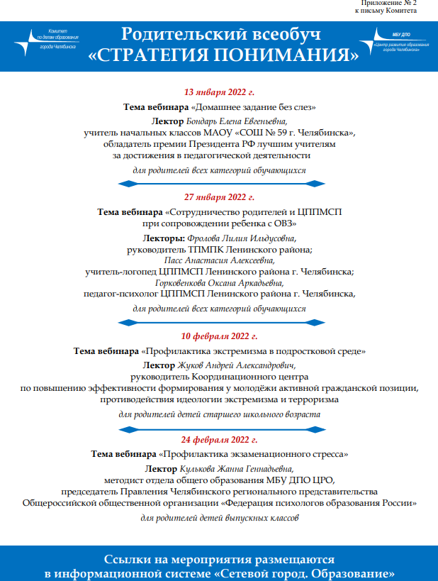 В 2022 году продолжает свою работу проект родительского всеобуча «Стратегия понимания». Первый вебинар на тему «Домашнее задание без слез» состоится 13 января 2022 г. Ссылки в электронном виде для подключения к трансляциям родительского всеобуча «Стратегия понимания» размещены на сайте МБУ ДПО ЦРО в разделе Вебинары / Календарь подключений. Предлагаем вам график родительского всеобуча на январь-февраль 2022 года. | |