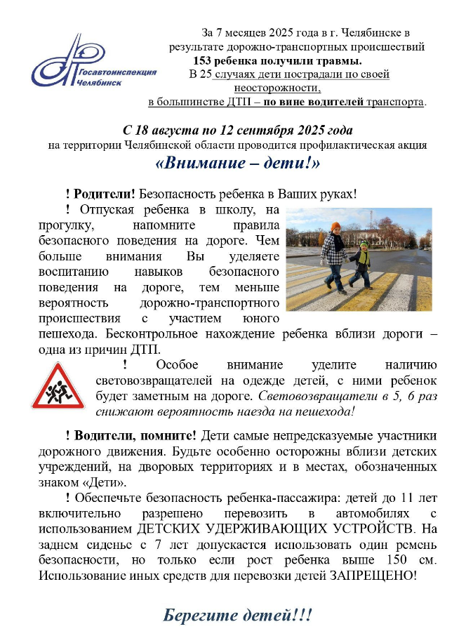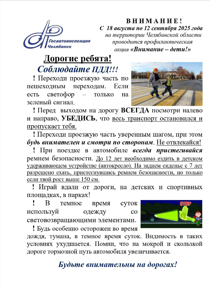 В Челябинской области с 18 августа по 12 сентября 2025 года проводится второй этап профилактической акции «Внимание — дети!». Эта акция направлена на снижение детского дорожно-транспортного травматизма и напоминает водителям о необходимости быть внимательными вблизи детских площадок и образовательных учреждений. Цели акции: